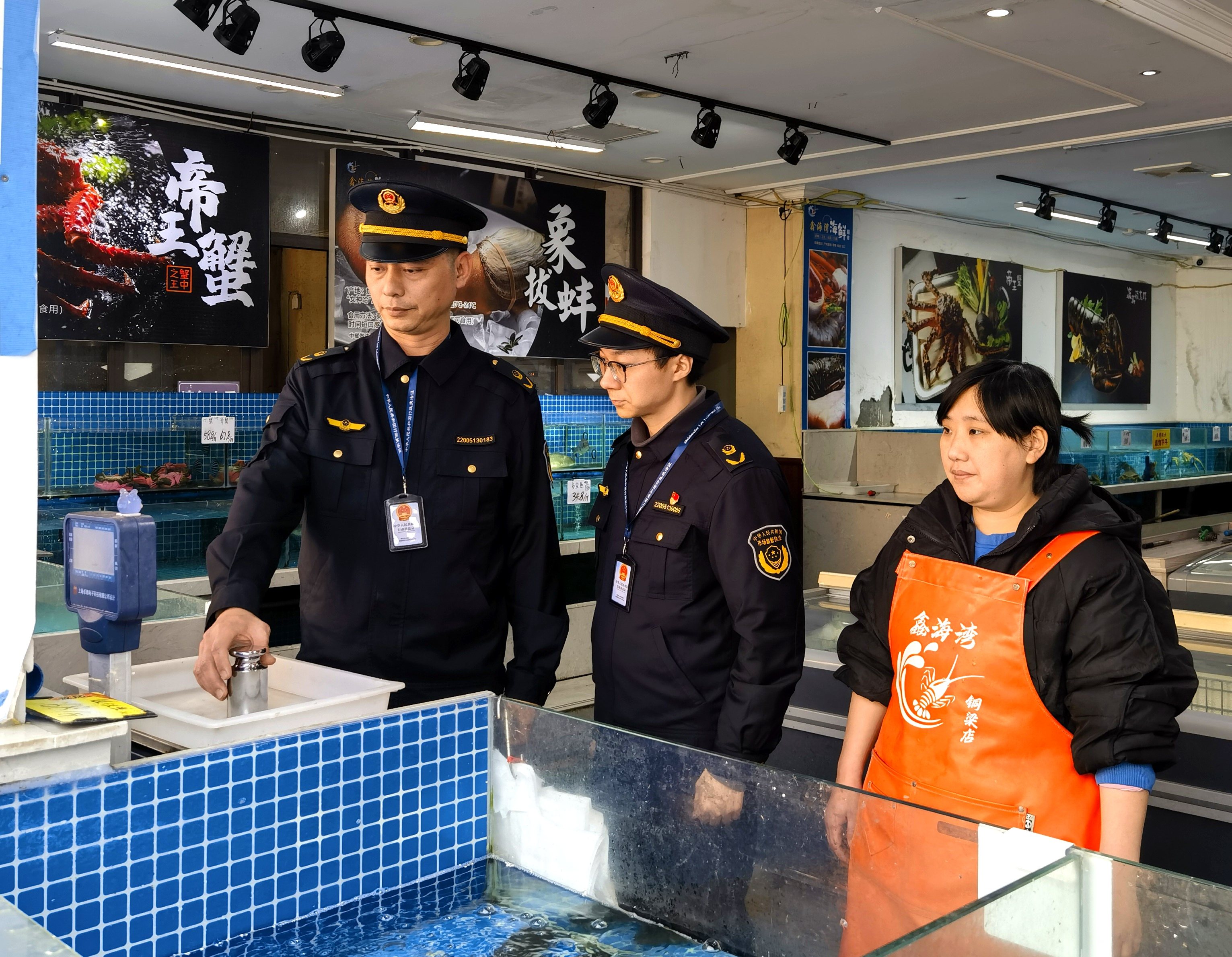 图为执法人员在一家海鲜水产经营门店用标准砝码核验经营户使用的电子计价秤。