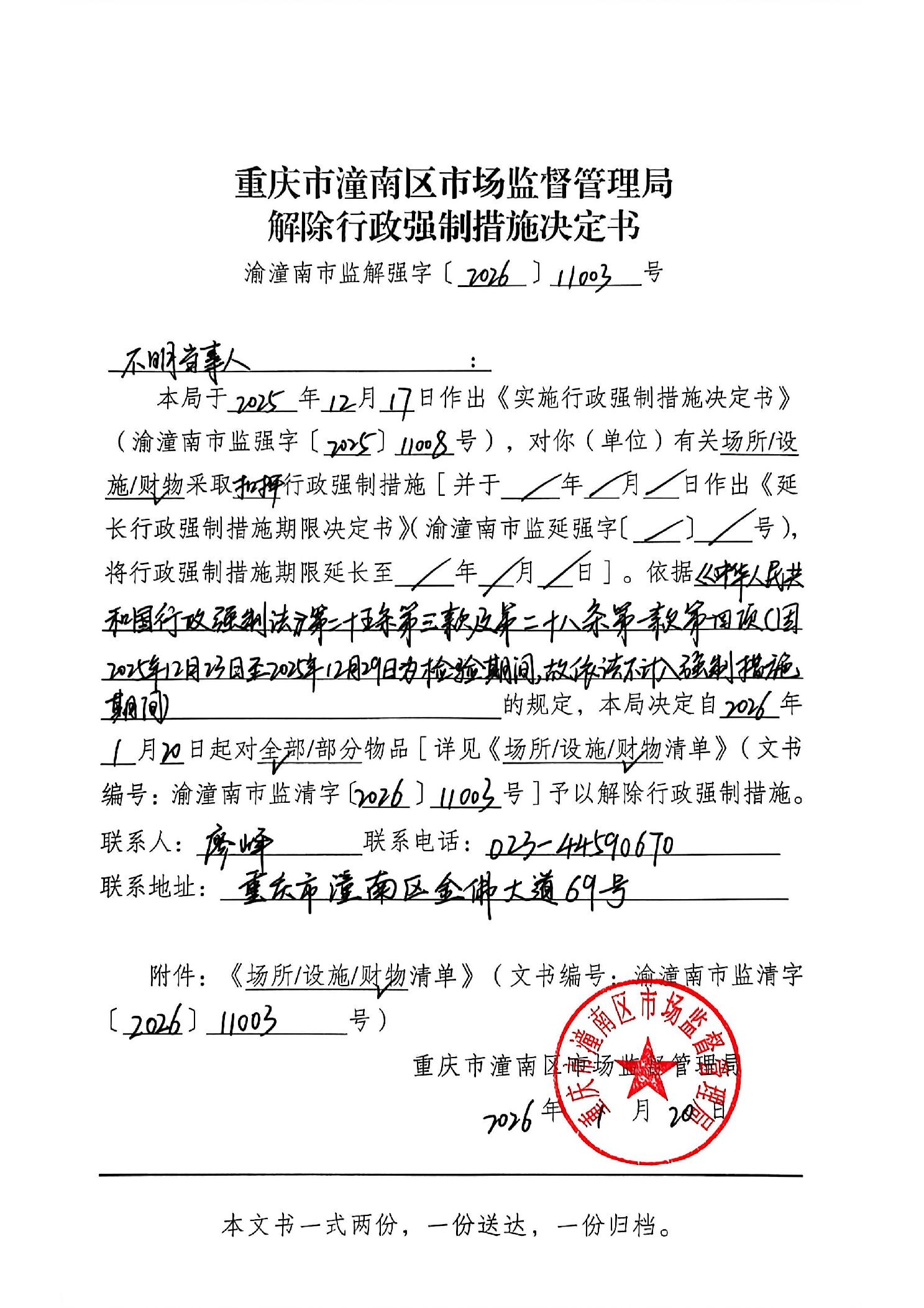 重庆市潼南区市场监督管理局解除行政强制决定书(渝潼南市监解强字〔2026〕11003号)