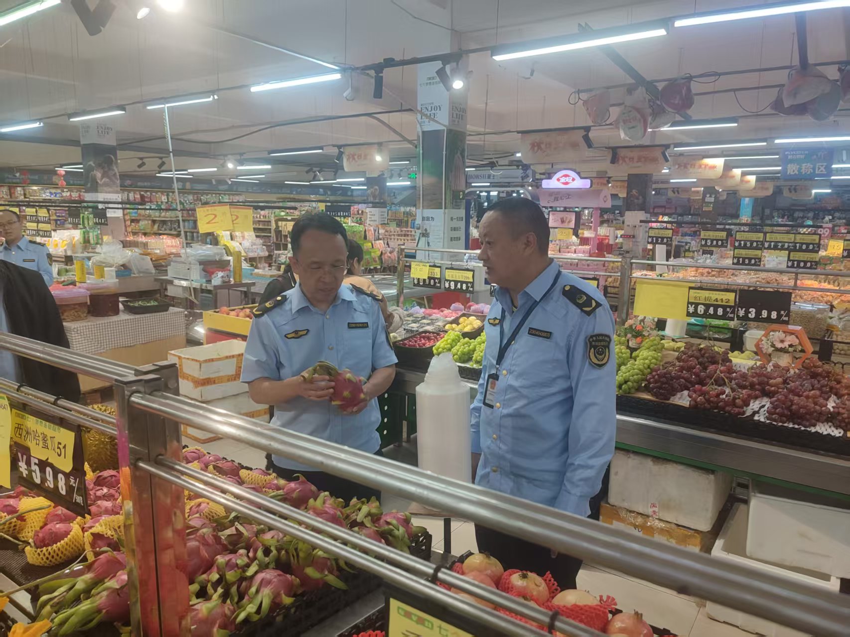 此次联合检查,对与泸县交界的重庆市永川区吉安镇的1个大型食品超市和1个餐饮服务经营单位开展了细致检查。重点检查了经营单位资质、从业人员健康管理、食品原料采购索证索票、食品贮存、散装食品标签标识、餐饮具清洗消毒、食品加工制作过程控制等环节,严防严控食品安全风险。