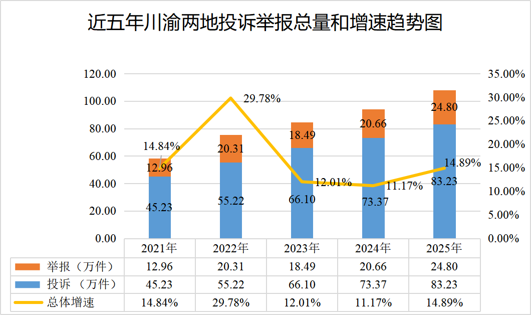 2025年,川渝两地12315热线和平台共登记处理投诉举报108.03万件,同比增长14.89%,为消费者挽回经济损失18577.28万元。其中,投诉83.23万件,同比增长13.44%;举报24.80万件,同比增长20.04%。四川省投诉举报总量77.37万件,同比增长16.36%;重庆市投诉举报总量30.66万件,同比增长11.32%。