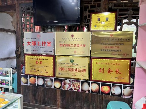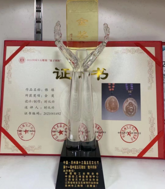 在江津玉产业蓬勃发展的背景下,时从兴充分挖掘利用江津玉这一特色资源,从选取纹路独特的江津玉石原料到雕刻成品,用精湛技艺展现江津玉温润光洁、宛若羊脂的特点,获得各类奖项13项,其中2021年荣获江津区第三届“津工精匠”、2022年全国技能大赛“全国百强工匠”,开启江津区玉石雕刻匠人首次入选新篇章,同时为健全江津玉上下游产业链、传承地域文化、建设“中国硒玉之城”贡献力量。在他小店里,有一面墙挂满了各种证书、摆放了许多奖杯,按他本人的话来说“并不是觉得自己得了这么多奖有多厉害,放在这里只是给自己多年磨练的一个交待,证明自己的努力没有白费。”