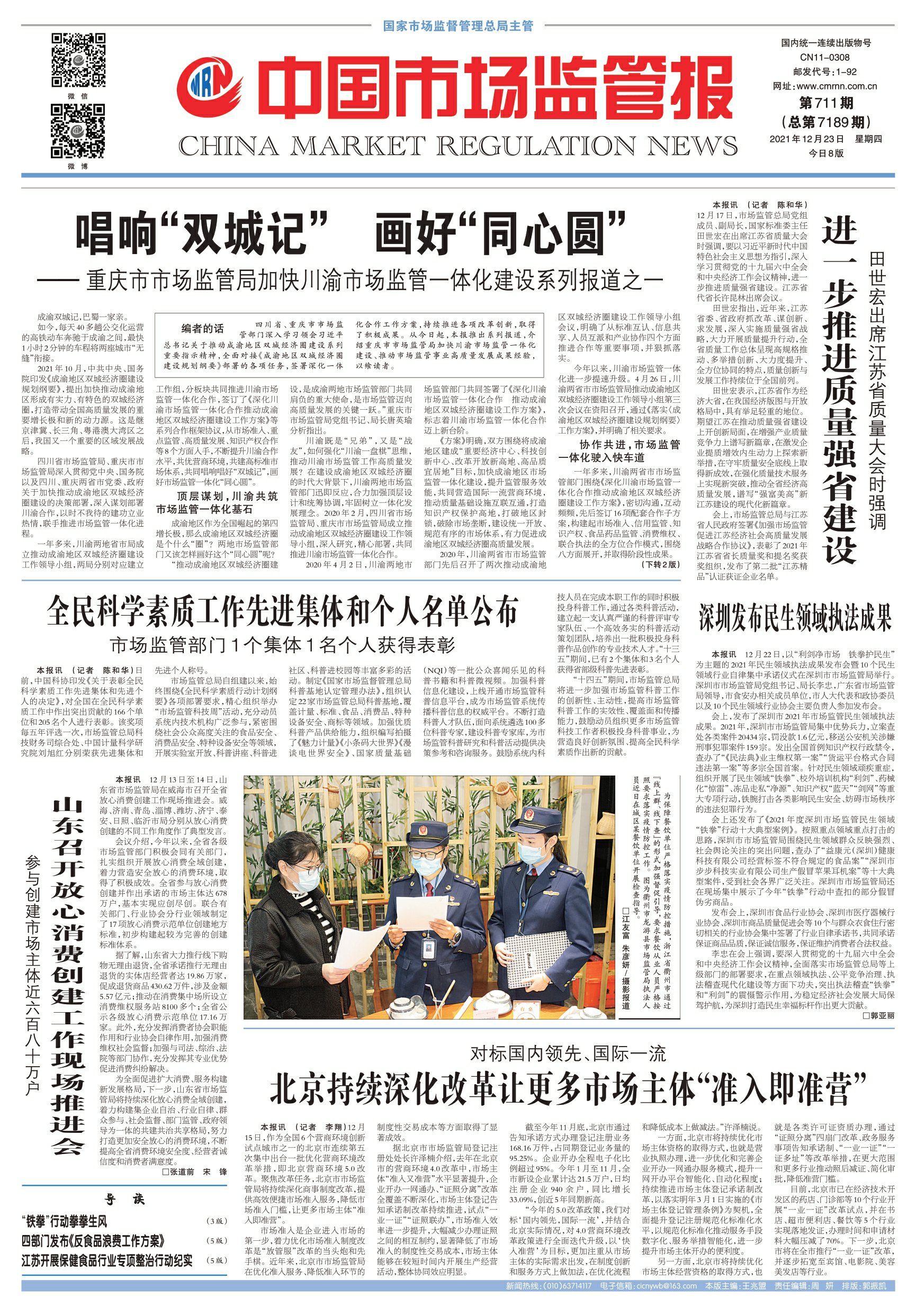 四川省、重庆市市场监管部门深入学习领会习近平总书记关于推动成渝地区双城经济圈建设系列重要指示精神,全面对接《成渝地区双城经济圈建设规划纲要》部署的各项任务,签署深化一体化合作工作方案,持续推进各项改革创新,取得了积极成果。从今日起,本报推出系列报道,介绍重庆市市场监管局加快川渝市场监管一体化建设、推动市场监管事业高质量发展成果经验,以飨读者。