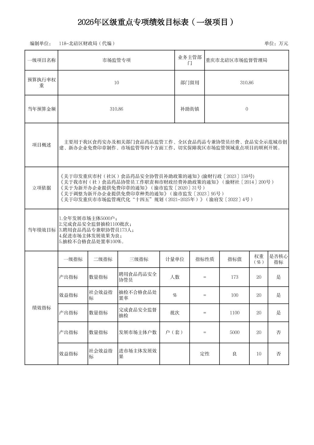 2026年区级重点专项绩效目标表(一级项目)