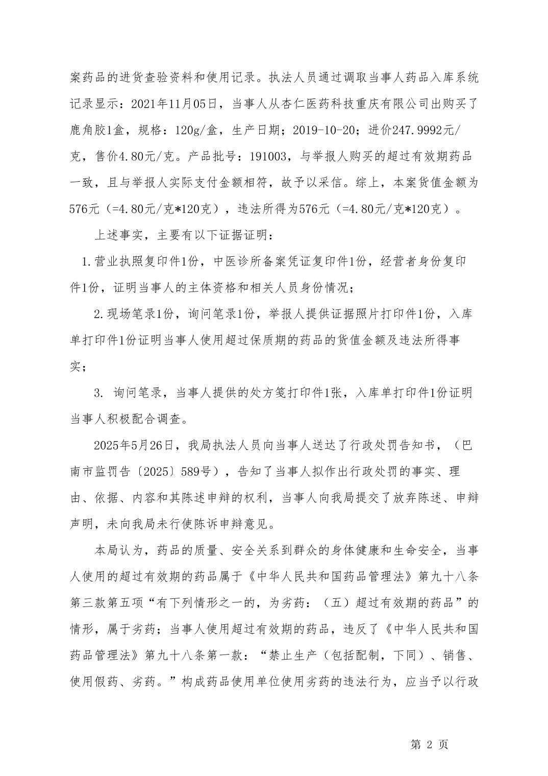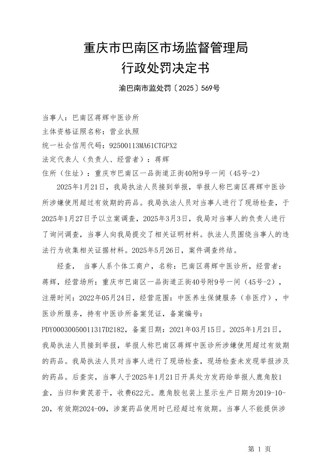 重庆市巴南区市场监督管理局行政处罚决定书(巴南区蒋辉中医诊所)