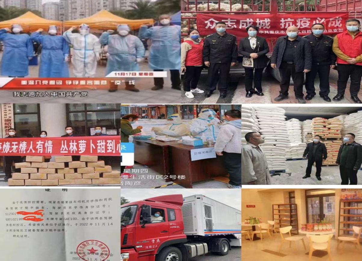 在区市场监管局、区民协党委的倡议下,各“小个专”党组织及其党员立即行动,为奋战在一线的抗疫人员和高风险区居民捐款捐物。如:11月16日,在区民协百胜镇分会党总支书记唐科的组织下,和珍溪(百胜)市场监管所的支持下,该总支全体党员自筹资金6000余元,向百胜镇菜农购买了5000斤白萝卜捐赠给重庆海源怡生活服务集团有限公司,委托该公司把这些散发着泥土芬芳的萝卜送给战斗在抗疫一线的工作者和封闭小区的业主;海源怡生活服务集团党委书记张嵱了解到处于抗疫第一线的蔺市街道和马鞍街道急需防疫物资,遂组织民协党委和海源怡生活物业集团党委的工作人员连夜购买,于11月17日分别为蔺市街道和马鞍街道捐赠了防护服100套、医用手套100双、护目镜50个、N95口罩100个、牛奶15件等价值2万余元的生活物资,有力地支持了两个街道的防疫、抗疫工作。