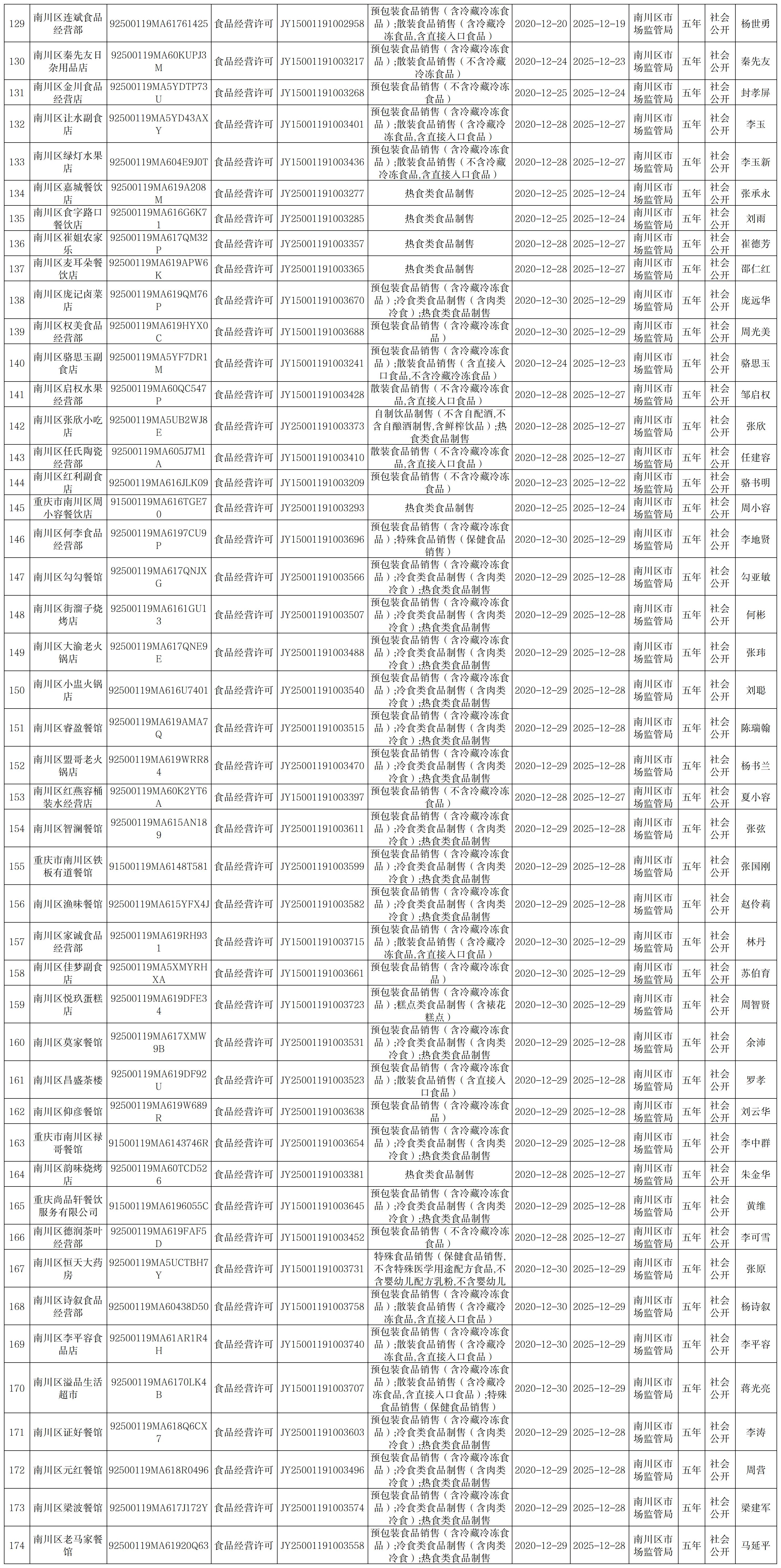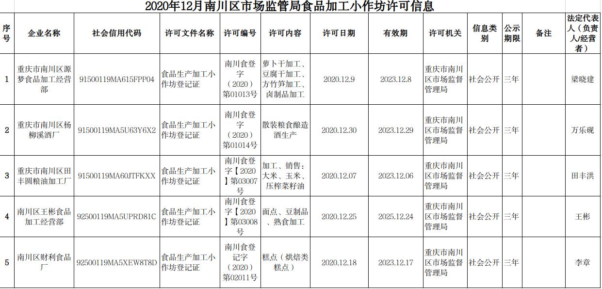 2020年12月南川区市场监管局食品行政许可信息