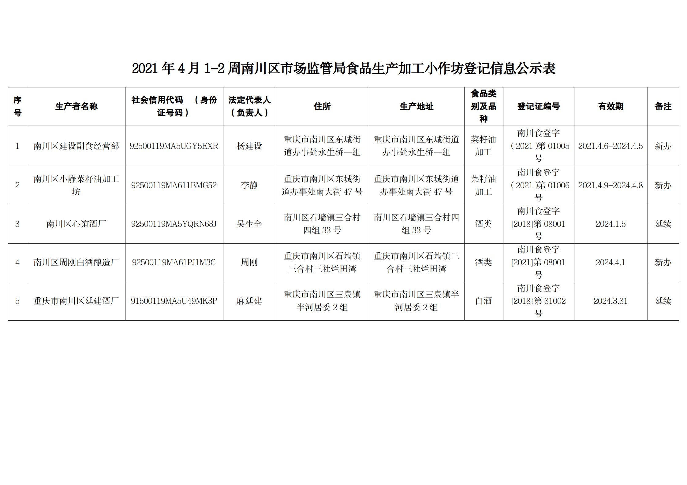 2021年4月1-2周南川区市场监管局食品行政审批许可信息