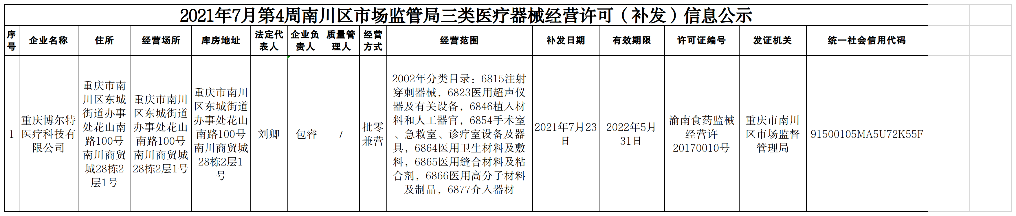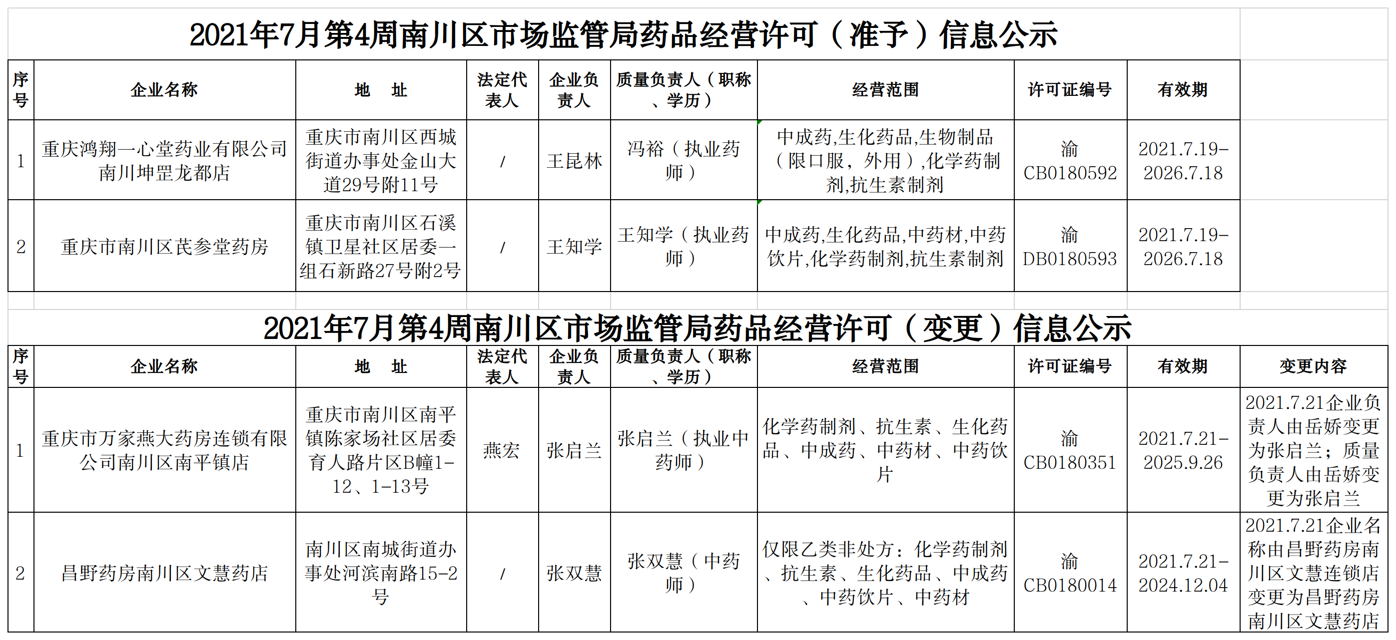 2021年7月第4周南川区市场监管局药品行政审批许可信息