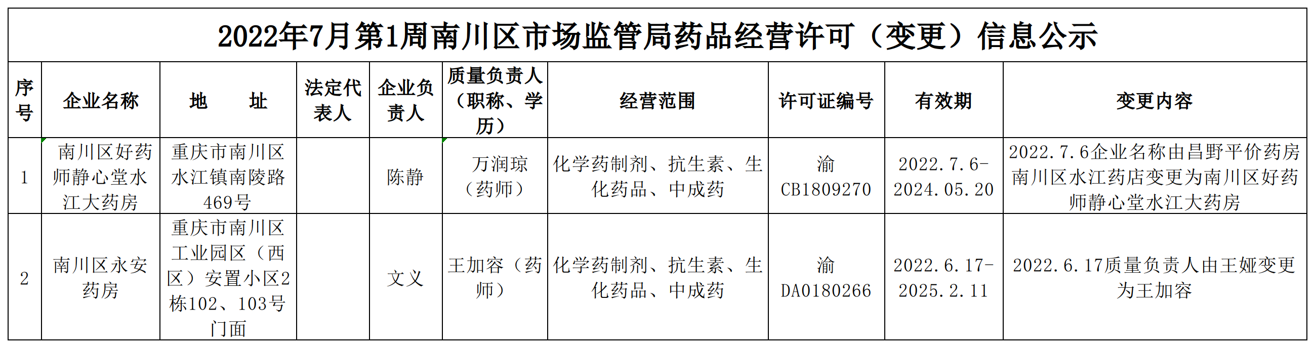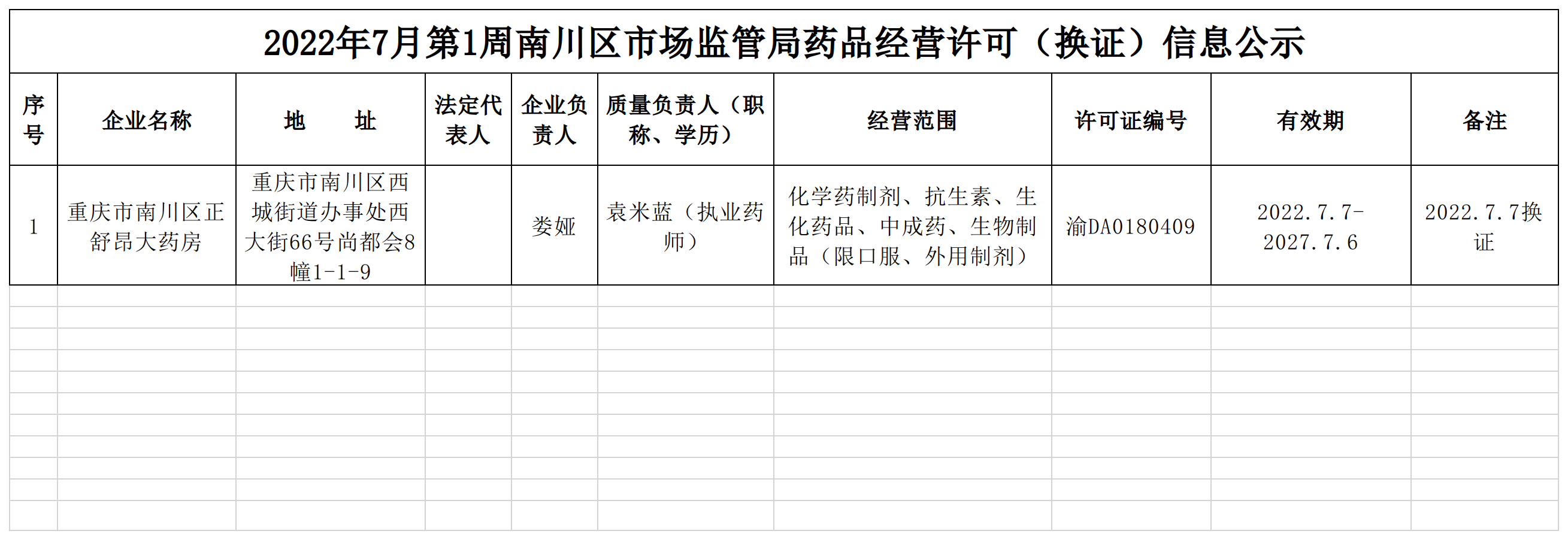 2022年7月第1周南川区市场监管局药品行政审批许可信息