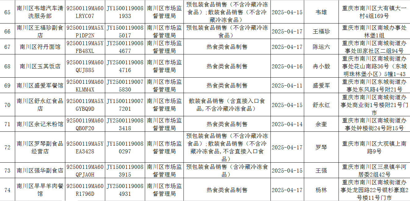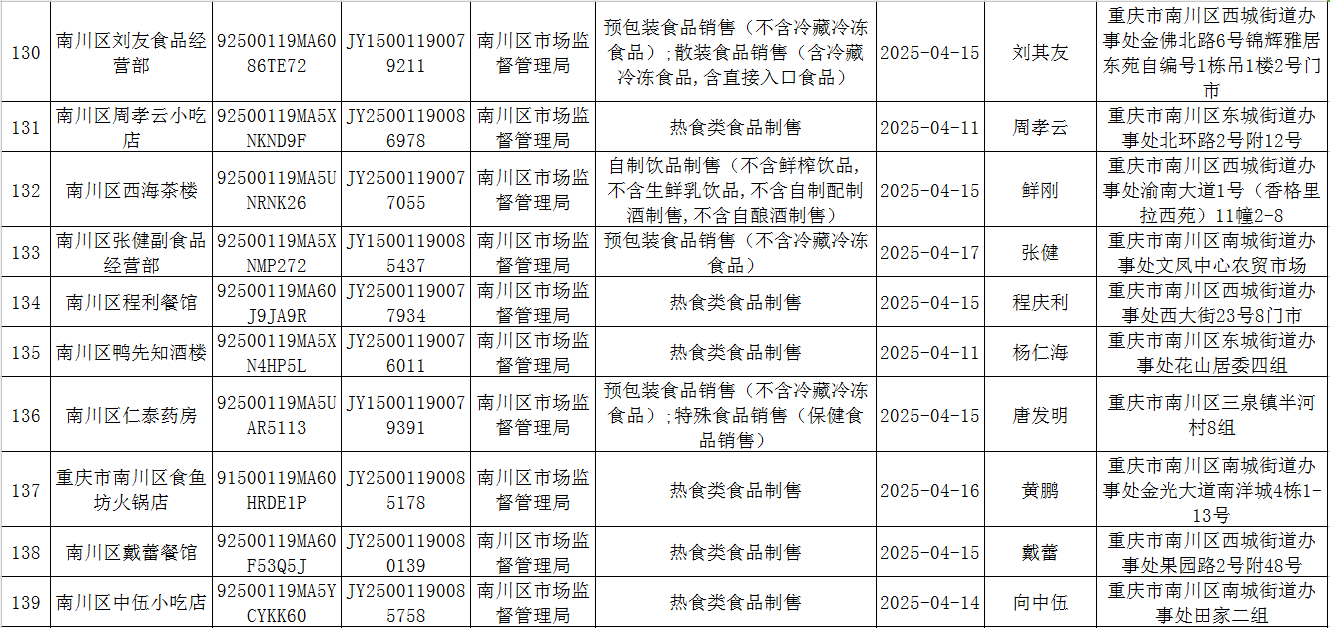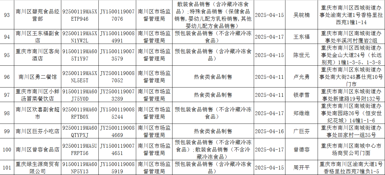2025年4月第3周南川区市场监管局食品行政审批许可信息