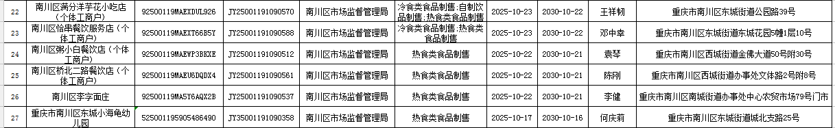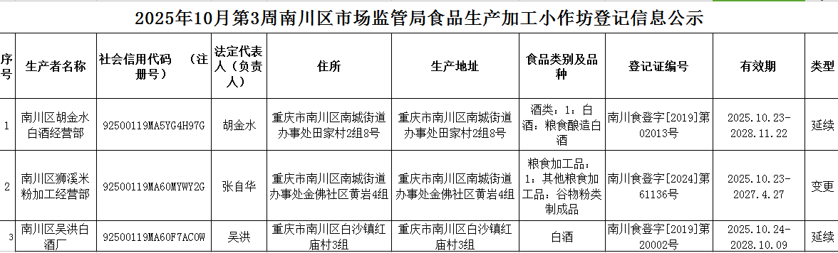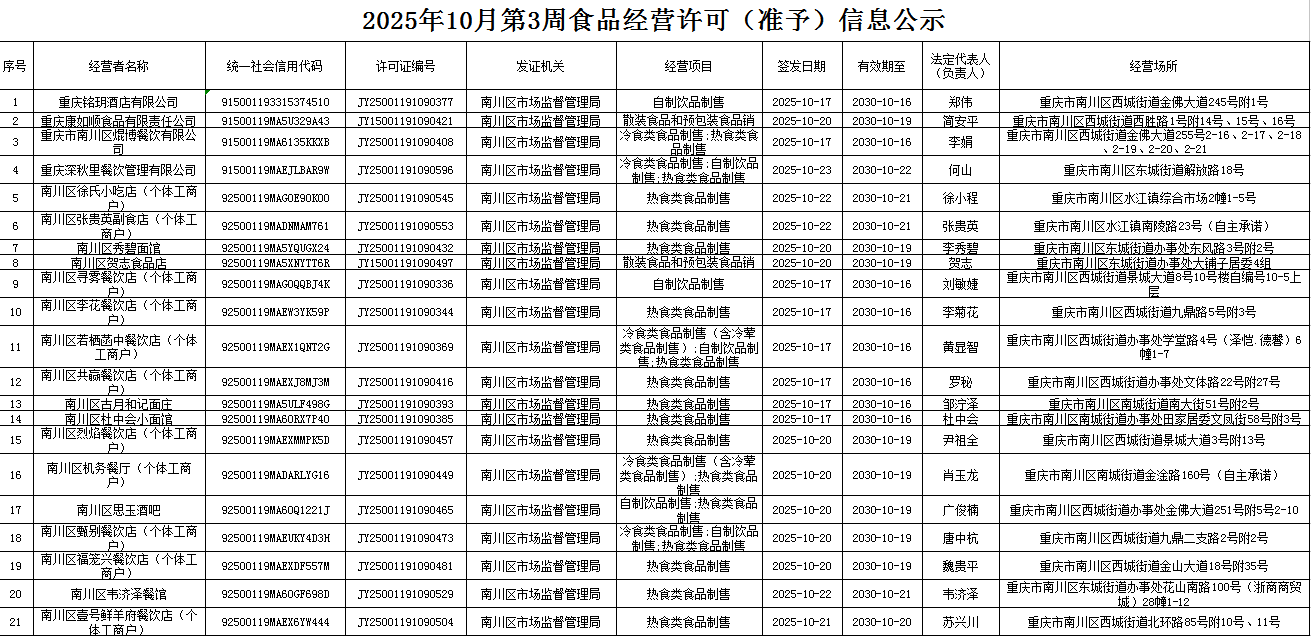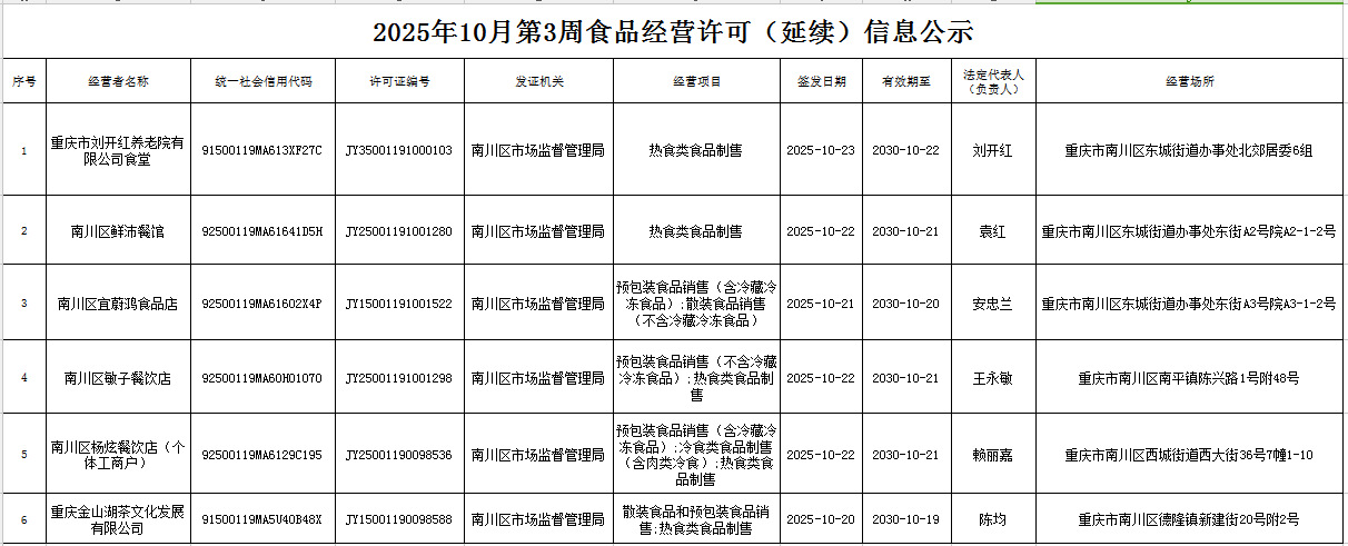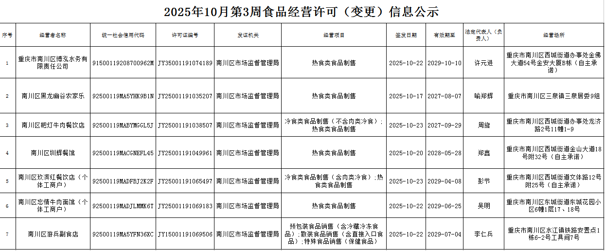 2025年10月第3周南川区市场监管局食品行政审批许可信息