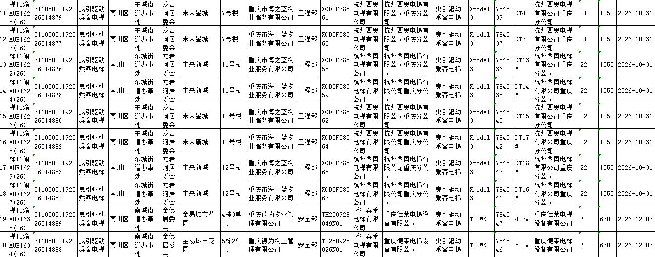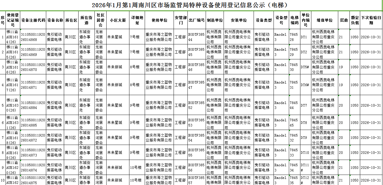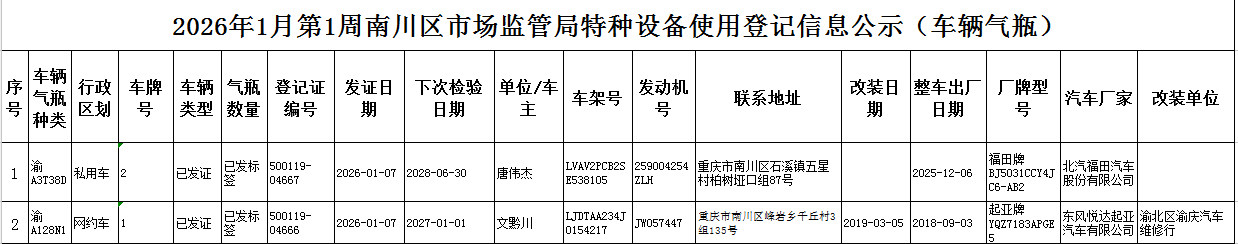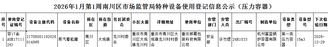 2026年1月第1周南川区市场监管局特种设备使用登记信息
