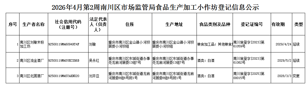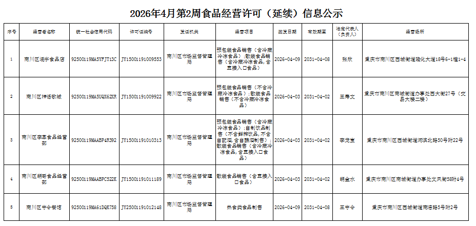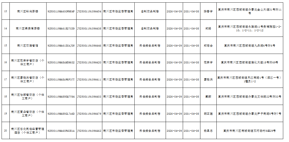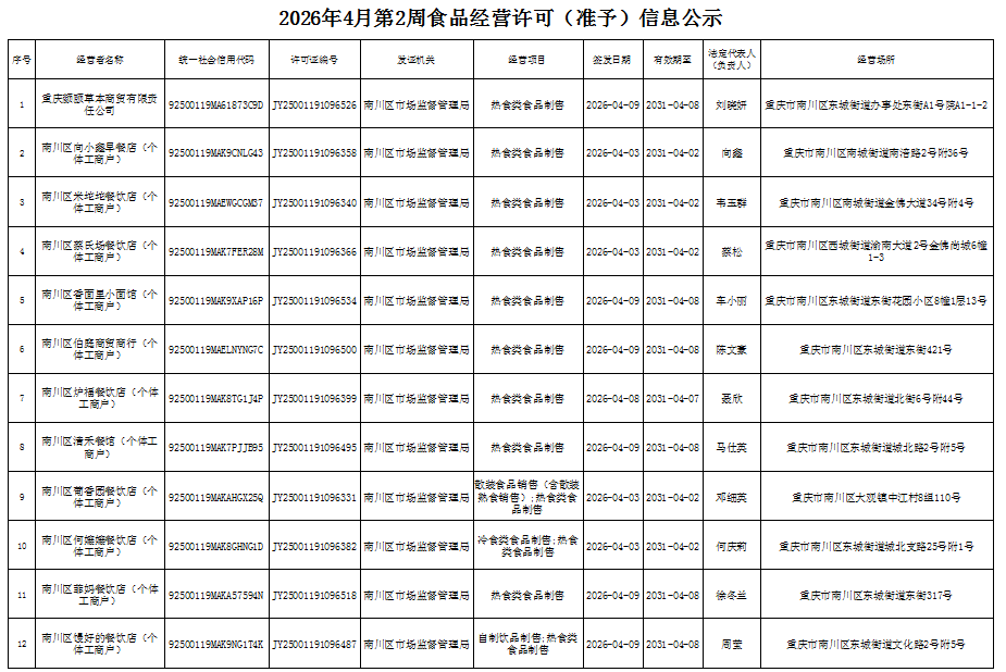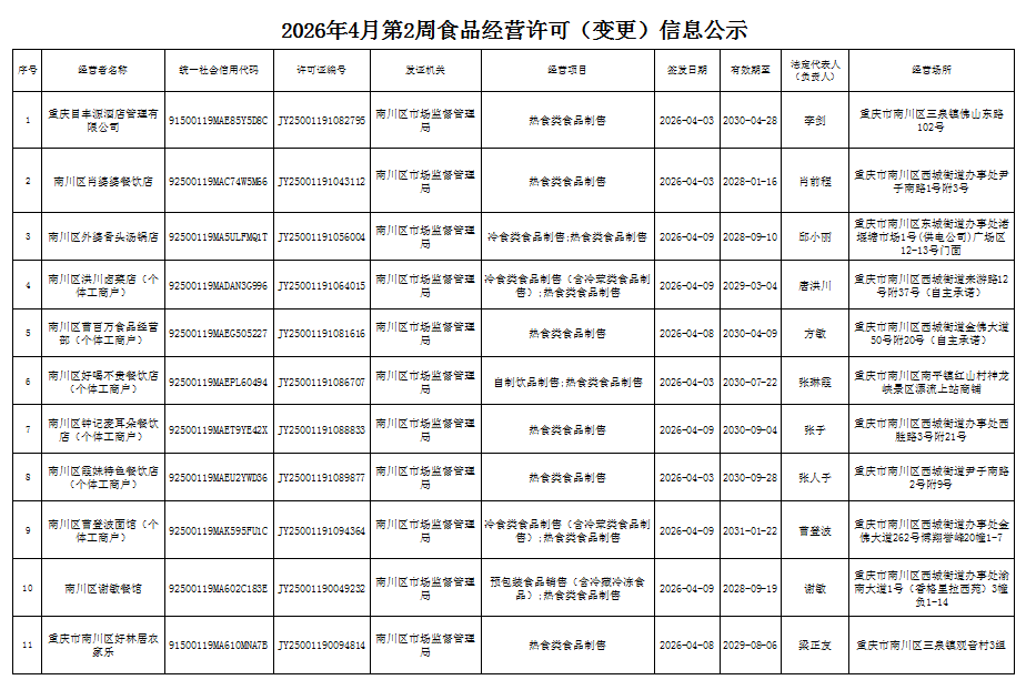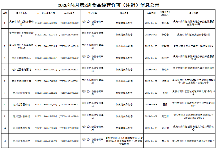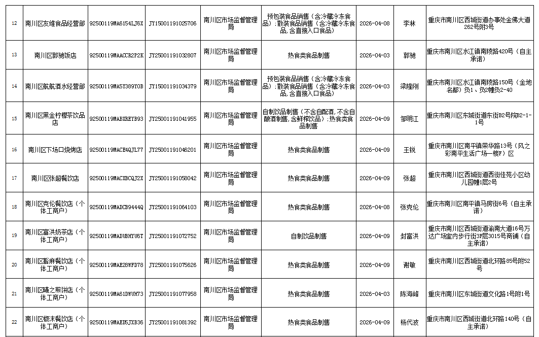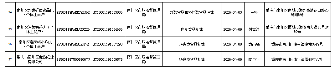 2026年4月第2周南川区市场监管局食品行政审批许可信息