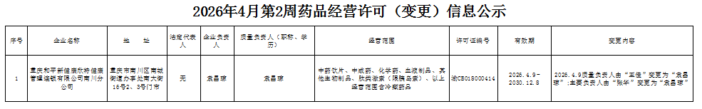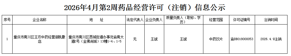 2026年4月第2周南川区市场监管局药品行政审批许可信息