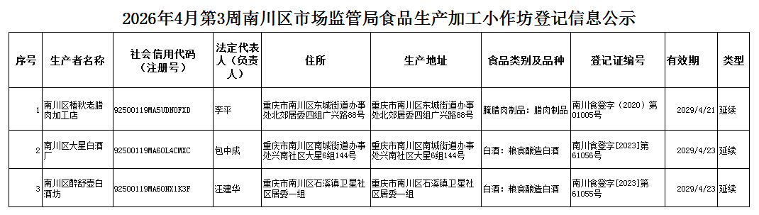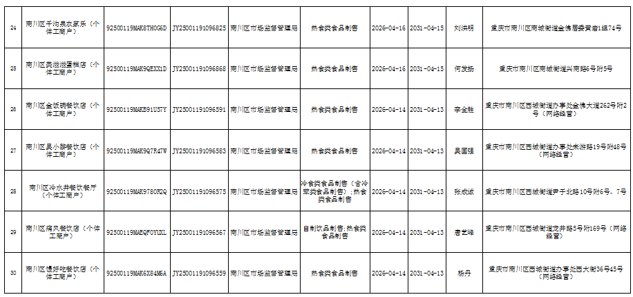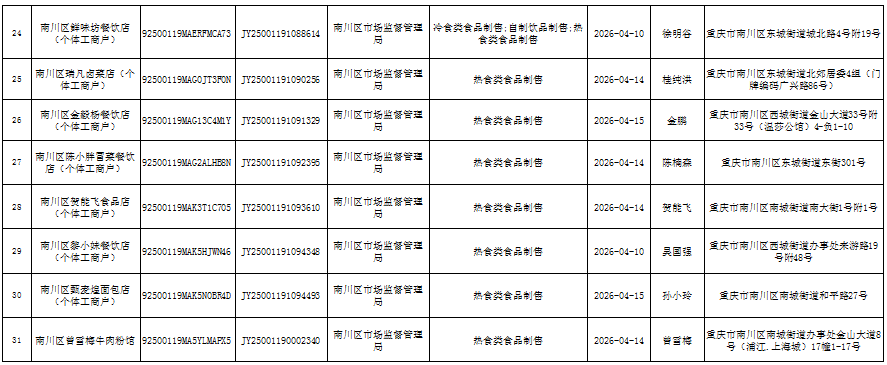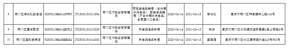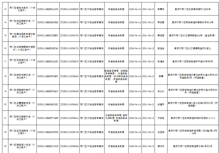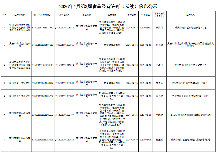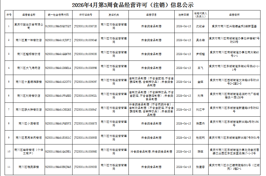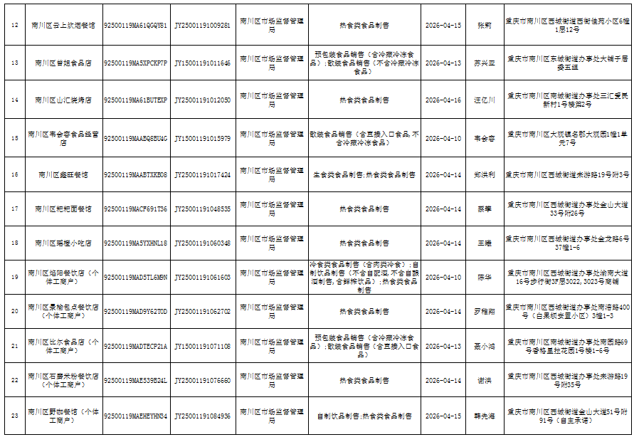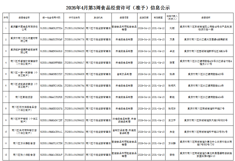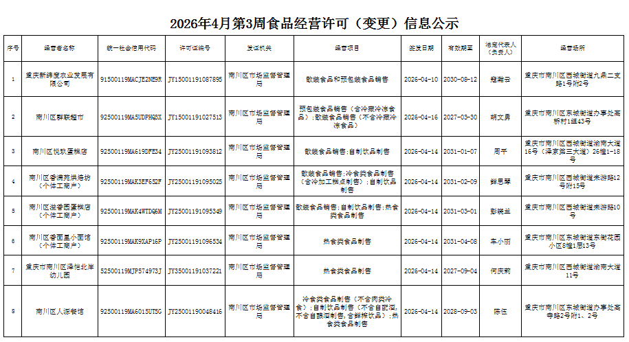 2026年4月第3周南川区市场监管局食品行政审批许可信息