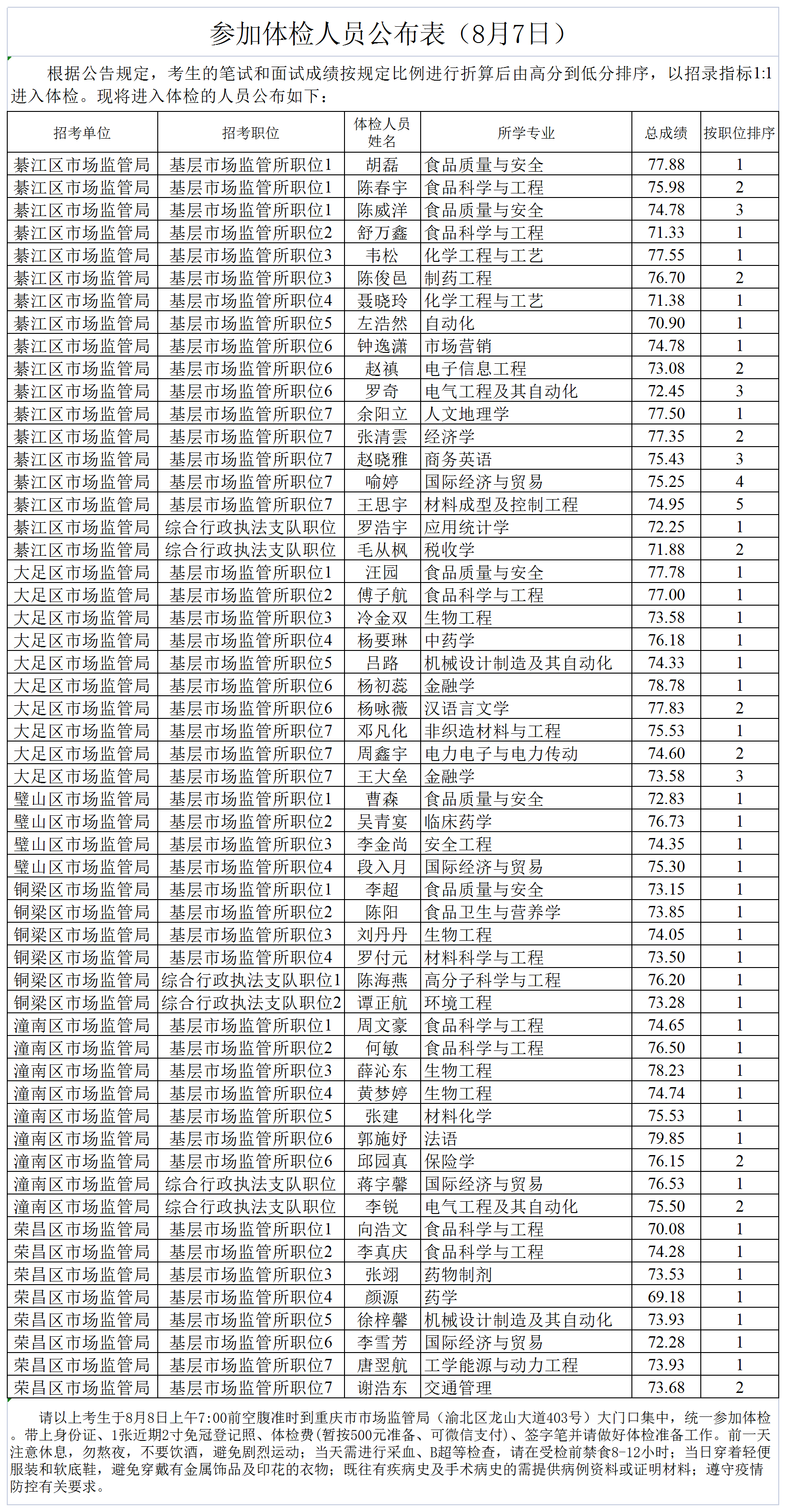 重庆市市场监督管理局2022年公开考试录用公务员成绩及参加体检人员公布(8月7日面试)