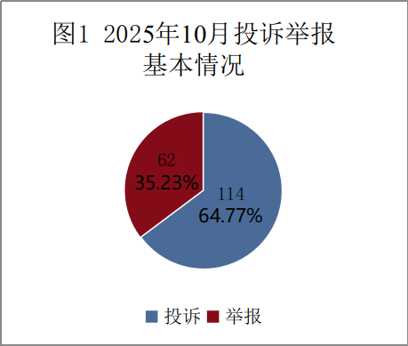 2025年10月,全区12315系统共收到消费者投诉举报176件:其中投诉114件,占投诉举报总量的64.77%,同比上涨21.28%;举报62件,占受理总量的35.23%,同比上涨47.62%。详见图1: