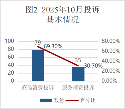 (一)投诉基本情况。2025年10月,全区12315系统共收到投诉114件,其中商品消费投诉79件,占投诉总量的69.3%,同比上涨1.28%;服务消费投诉35件,占投诉总量的30.7%,同比下降118.75%。详见图2: