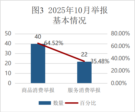 (二)举报基本情况。2025年10月,全区12315系统共收到举报62件,其中商品消费举报40件,占举报总量的64.52%,同比上涨73.91%;服务消费举报22件,占举报总量的35.48%,同比上涨16%。详见图3:
