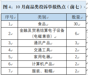 (三)商品消费投诉举报热点。10月份全区商品类投诉举报热点集中在食品、金融及贸易结算电子设备(电磁兼容)、通讯产品等。10月商品类投诉举报报表(前七)详见图4: