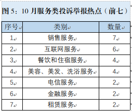 (四)服务消费投诉举报热点。10月份全区服务类投诉举报热点集中销售服务类、互联网服务类等。10月服务类投诉举报(前七)详见图5: