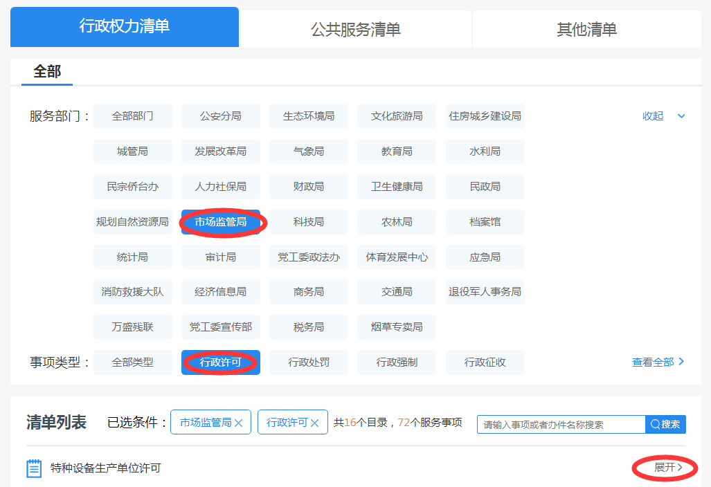 “服务部门”选择“市场监管局”,“事项类型”选择“行政许可”,在清单列表中各具体服务事项右侧点击“展开”。如图二