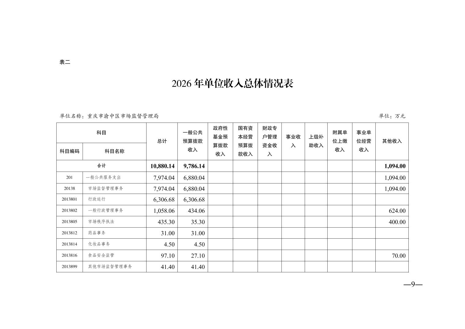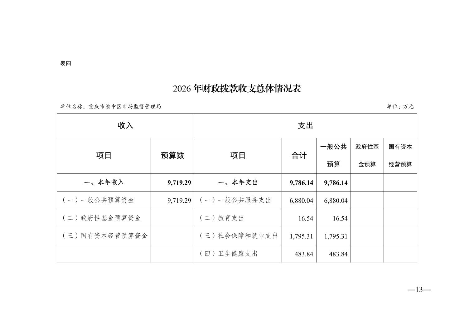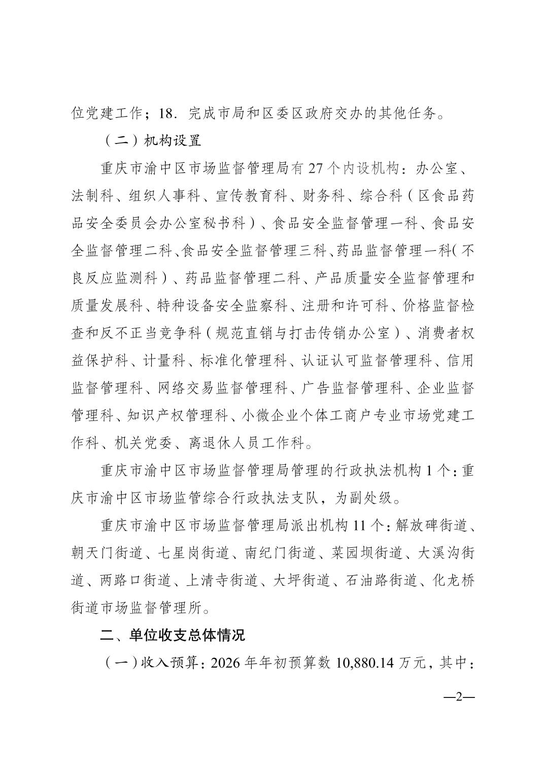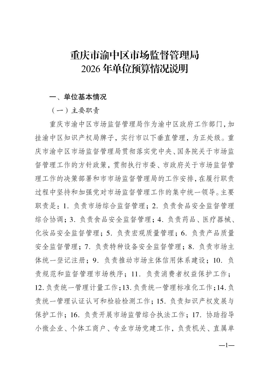 重庆市渝中区市场监督管理局2026年单位预算情况说明